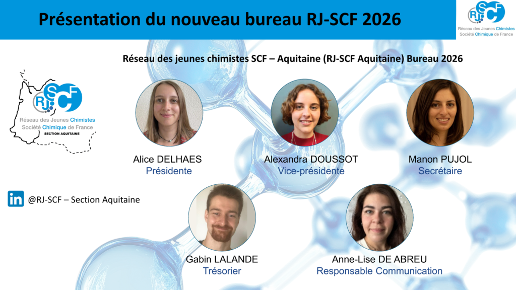 Les membres du bureau jeune doivent être affiliés SCF et âgés de moins de 35 ans (mandat d’un an renouvelable). Pour plus d’informations, contacter bureau.rjscf.aquitaine@societechimiquedefrance.fr